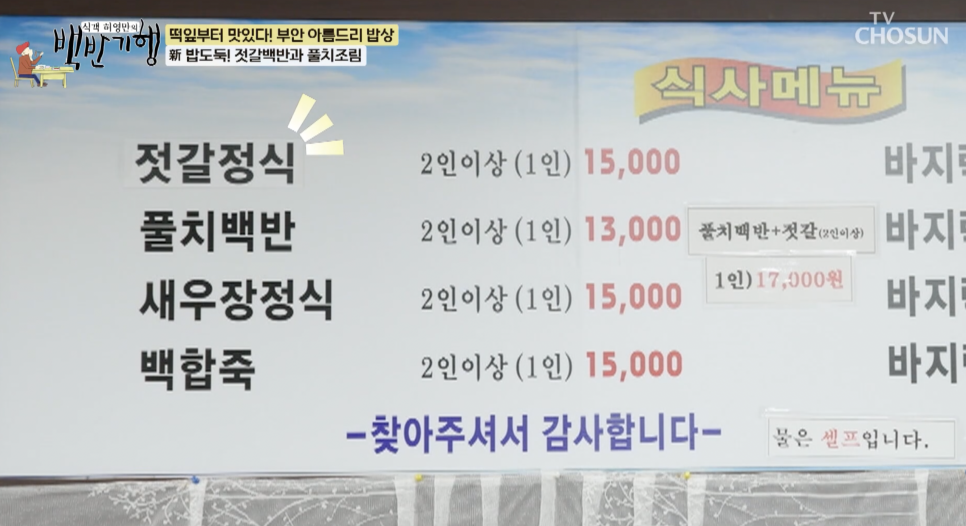 | 대표 메뉴 | 백합정식 | 피순대&순댓국 | 풀치백반, 젓갈정식 |