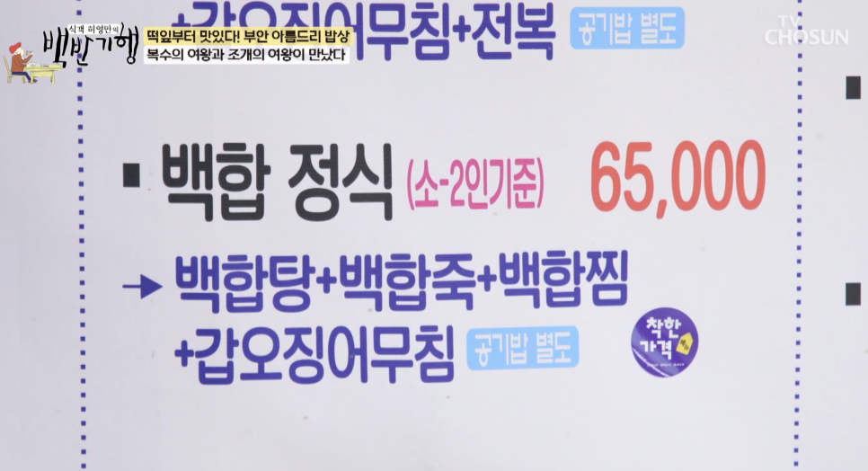 - 백합정식 구성: 백합죽, 백합탕, 백합찜, 갑오징어무침, 가지탕수육 등