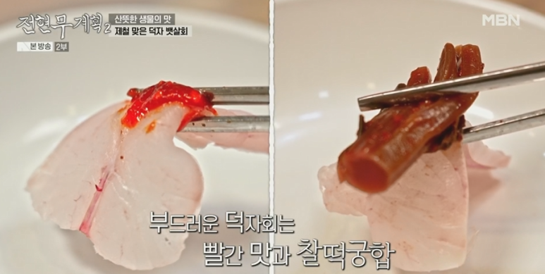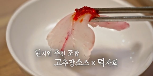 전현무팀이 먹은 생선은 바로 이 ‘덕자’입니다. 고소하고 두툼한 회 한 점에 단호박전까지 곁들이면 그야말로 여름 미식 완성!